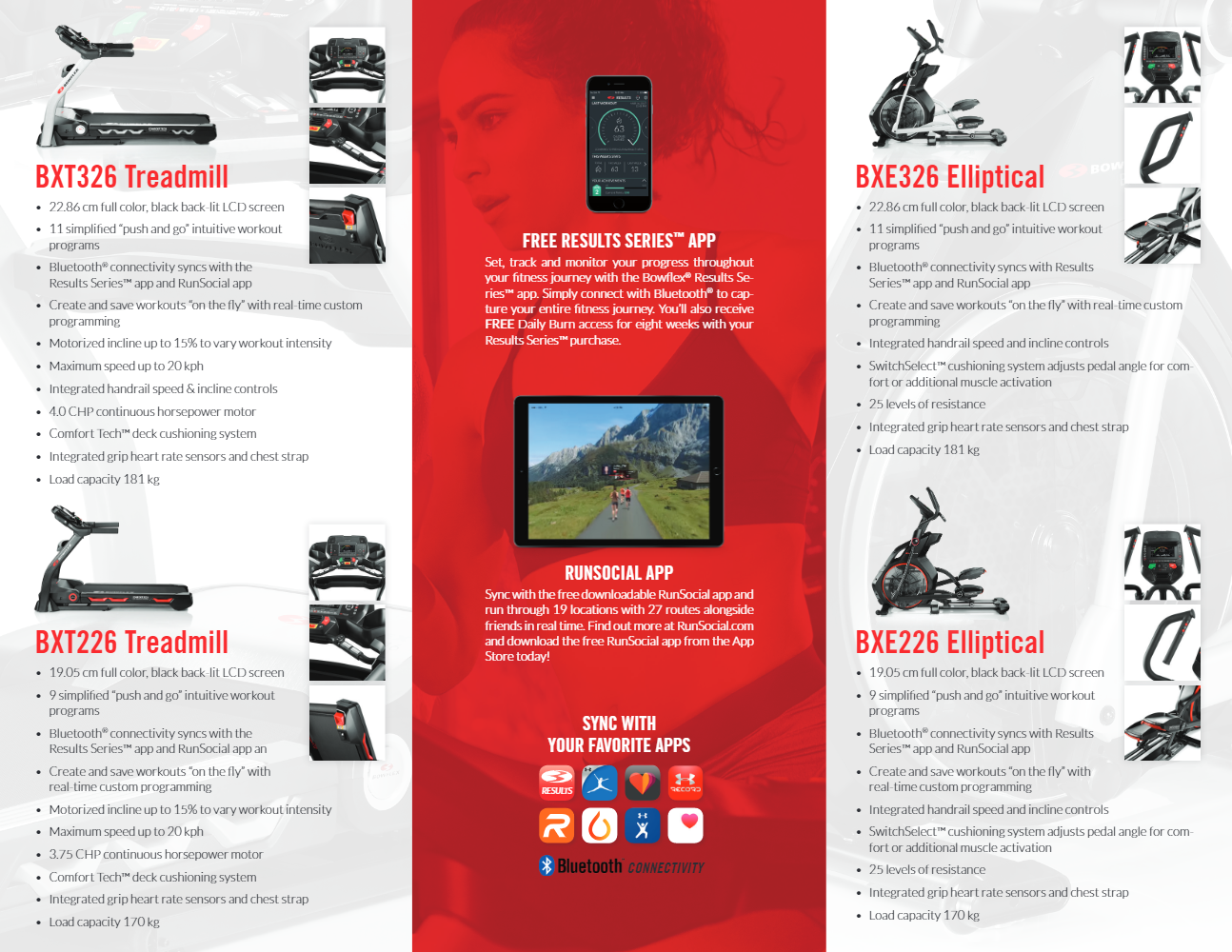 Отслеживайте количество сжигаемых калорий, время и интенсивность тренировки, а также ваши показатели выносливости в мобильном приложении Bowflex App®. Специально разработанным, чтобы помочь мотивировать вас на пути к достижению вашей заветной цели. Мобильное приложение позволяет устанавливать фитнес цели и отслеживать достигнутый результат, планировать календарь тренировок, транслировать обучающие видео и синхронизировать данные с партнерскими приложениями, такими как GoogleFit, AppleHealth и MyFitnessPal®.